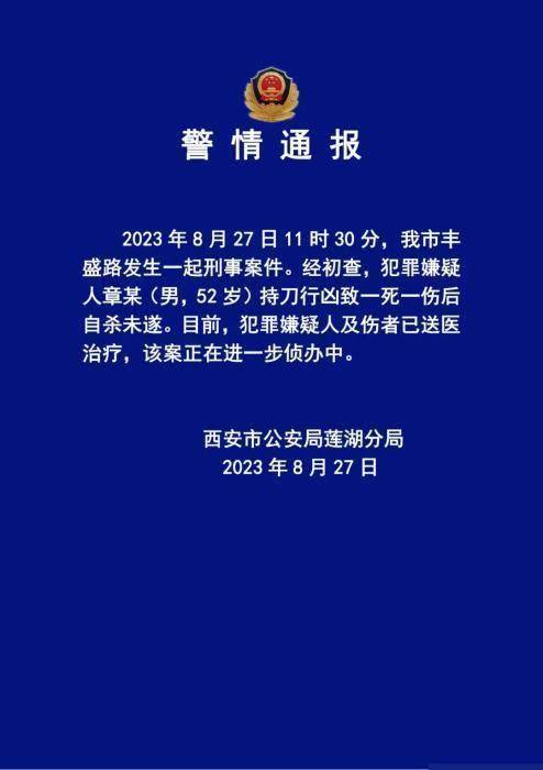 西安一男子27日持刀行兇致一人死亡、一人受傷后未遂自盡。據警方通報,案發地點為西安市豐盛路,犯罪嫌疑人章某,男性,52歲。目前,犯罪嫌疑人和傷者均已送醫治療,案件正在進一步調查中。